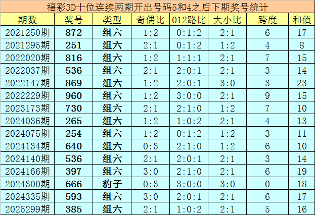 十位号码:前两期十位分别出现奖号5-4,历史上福彩3D连续前后分别开出号码5-4的现象共开出94次。在十位5-4的现象出现时,最近15期其下期分别开出号码:872-251-816-536-869-960-730-265-254-640-536-397-666-593-385;