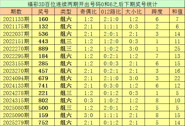 百位号码:连续两期百位出号分别为:0-6,历史上福彩3D连续两期前后分别出号0-6的奖号共出现72次。在百位0-6的奖号现象出现时,近15期下期分别出号:160-132-536-443-889-184-285-457-679-741-221-802-500-159-752;